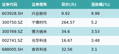截至午间收盘,正极材料主题涨跌幅最高的五只股票为:兴业股份(603928.SH)、宁德时代(300750.SZ)、德方纳米(300769.SZ)、光华科技(002741.SZ)与容百科技(688005.SH)。详情见下表: